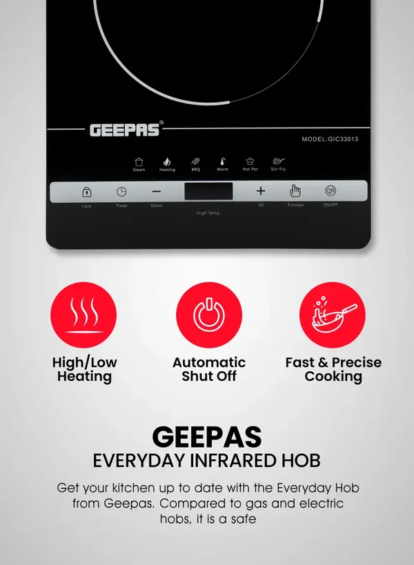 GEEPAS DIGITAL INFRARED COOKER GIC33013 |2000W CERAMIC HEATING ELEMENT| TOUCH CONTROL| LED DISPLAY| 10 ADJUSTABLE POWER LEVELS| TIMER, SAFETY PROTECTION| 2 YEARS WARRANTY
